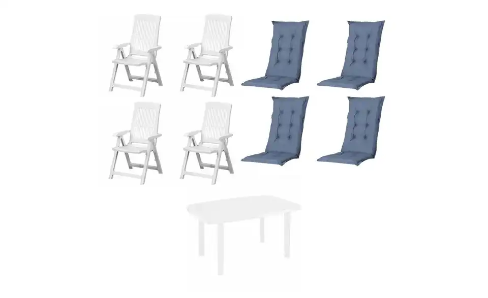 - Lieferumfang / mitgeliefertes Zubehör4 x Klappsessel weiß, 1 x Tisch weiß, 4 x Auflage kobalt