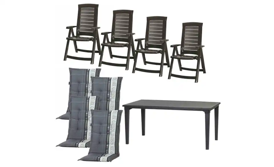 - Lieferumfang / mitgeliefertes Zubehör4 x Klappsessel, 4 x Auflagen,1 x Futura Tisch